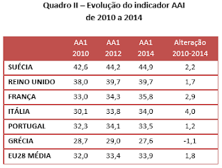 Apresentam-se alguns quadros para análise da situação Portugal neste contexto. Seleccionaram-se alguns estados membros: Portugal, Espanha, França, Itália, Reino Unido e Suécia e ainda a média da UE28 para facilitar a leitura. A selecção baseou-se na agregação por grupos descritos no parágrafo seguinte. Os dados completos podem consultar-se em Active Ageing Index 2014 Analytical Report.