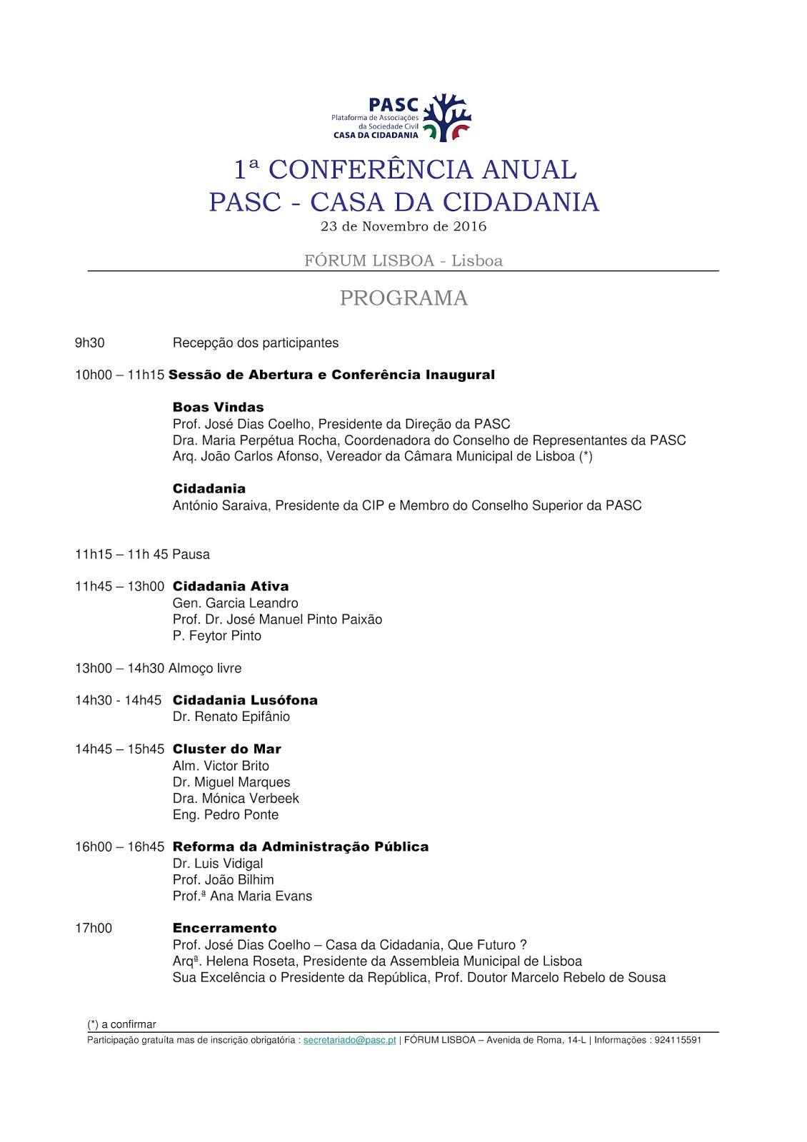 de inscrição obrigatória para o mail secretariado@pasc.pt.