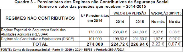 Segundo a Conta da Segurança Social de 2014 Parte II, existiam em 2014, 274.000 pensionistas nos regimes não contributivos que recebiam nesse ano uma pensão inferior a 240€ por mês, e que tiveram, em 2015 um aumento médio de 7 cêntimos por dia. E tenha-se presente que o valor destas pensões é muito inferior ao valor do limiar da pobreza, que era em 2013 de 352,6€ por mês (14 meses).