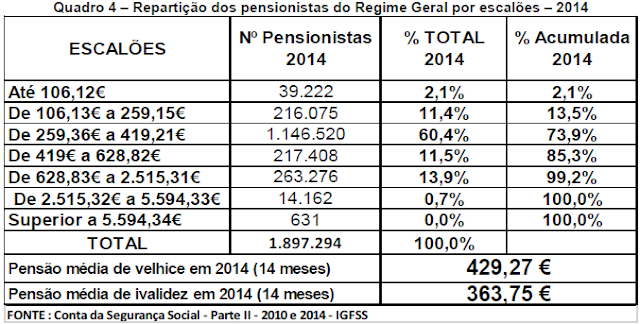 O quadro 3 com dados da Conta da Segurança Social de 2014, mostra a situação em que se encontram os pensionistas dos regimes não contributos da Segurança Social, ou seja, os que têm direito a estas pensões por não terem recursos mínimos para viver.