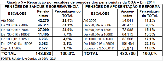 Na CGA, o quadro 5 mostra de acordo com dados do Relatório e Contas da CGA referente a 2014, a repartição dos pensionistas (pensões de sangue e de sobrevivência, de aposentação e de reforma) da Função Pública por escalões de pensões em 2014.