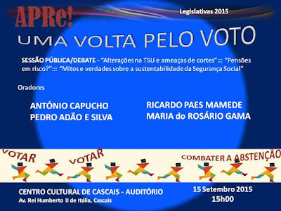 Integrada na campanha que a APRe! está a promover, designada “Uma volta pelo VOTO”, vai-se realizar na próxima terça-feira, dia 15 de Setembro pelas 15h, uma sessão pública de debate promovida pela APRe!, no Auditório do Centro Cultural de Cascais, junto à Cidadela em Cascais, subordinada ao tema “Mitos e verdades sobre a sustentabilidade da Segurança Social”, em que participam a Presidente da APRe! Maria do Rosário Gama, e os oradores convidados, António Capucho (Assembleia Municipal de Sintra), Pedro Adão e Silva (ISCTE / IUL) e Ricardo Paes Mamede (ISCTE / IUL).