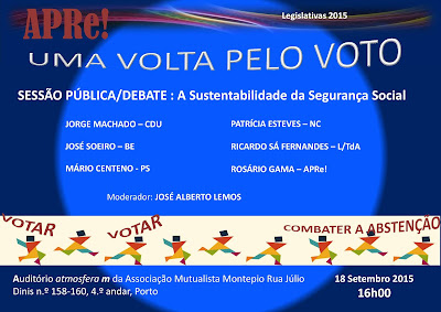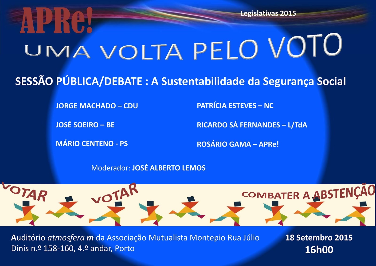 No âmbito da campanha "Uma volta pelo VOTO", promovida pela APRe!, realizou-se no passado dia 18 de Setembro de 2015, entre as 16 às 19 horas, no auditório ‘Atmosfera M’, na Rua Júlio Dinis, no Porto, uma sessão pública de esclarecimento/debate, cujo tema foi: “A sustentabilidade da Segurança Social”, que contou com a presença da Presidente da Direcção da APRe!, Maria do Rosário Gama, e de vários dirigentes, a nível nacional, da Associação, e com intervenções dos representantes de várias das forças políticas que vão a votos, por este distrito, nas próximas legislativas: os que se dispuseram a estar presentes para apresentar e debater, com a APRe!, as suas propostas para o país, mormente no que respeita à Segurança Social.